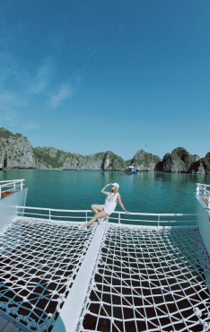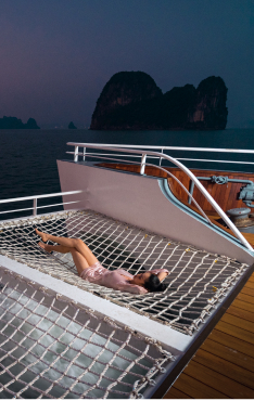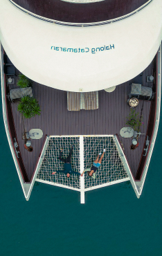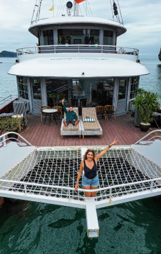 Once you enjoy The Halong Catamaran, our hope is that you will be back for another. Our beautiful cruise ship features 99 seats, an open air top deck for viewing and photo shoots, and the highlight of the catamaran design is the beautiful hammock like loft nets suspended over the water between the two hull point of the ship, so you can sit back and water the water rushing below you.