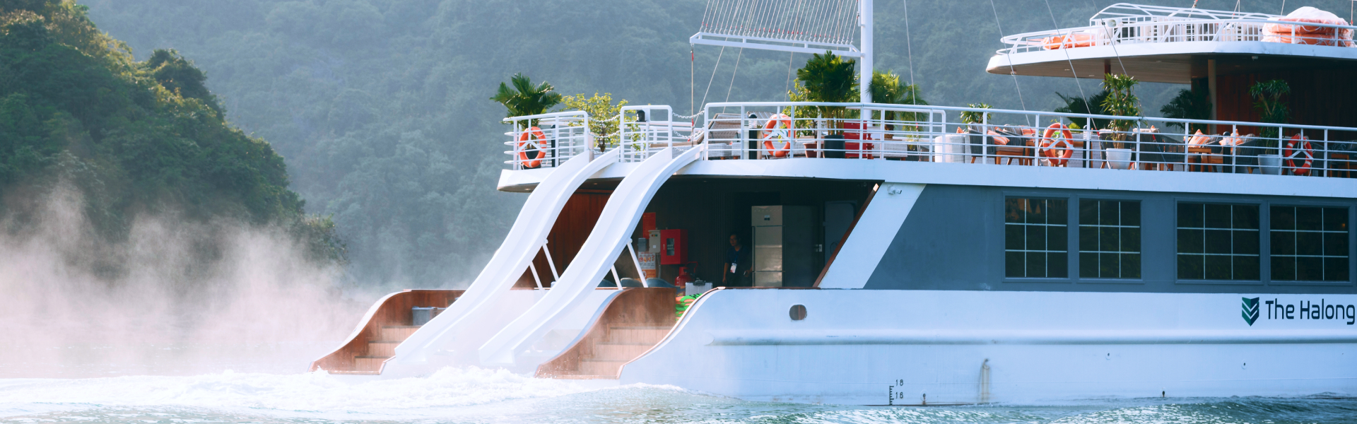 Exploring Halong Bay deserves an amazing yacht to enjoy the experience to its maximum potential. The Halong Catamaran offers a luxurious cruising experience with a strong commitment to service quality. Our luxury facilities have been artfully crafted by Vietnamese cultural symbols to make your stay comfortable and pleasant. Our facilities include outdoor/indoor restaurant seating, bar/lounge, a sundeck with sunbeds, couch and table seating indoors, as well as "lounge nets" in the front of the boat suspended over the water, between the two hulls of the ship for lounging in while you watch the water rushing below you.